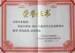 2013年4月,興業(yè)集團(tuán)榮獲“日照市2013年迎春燈會活動特別貢獻(xiàn)獎”